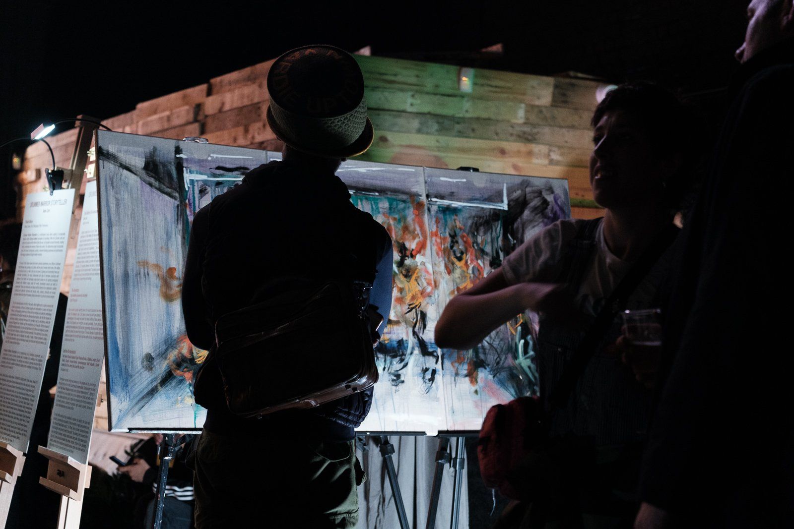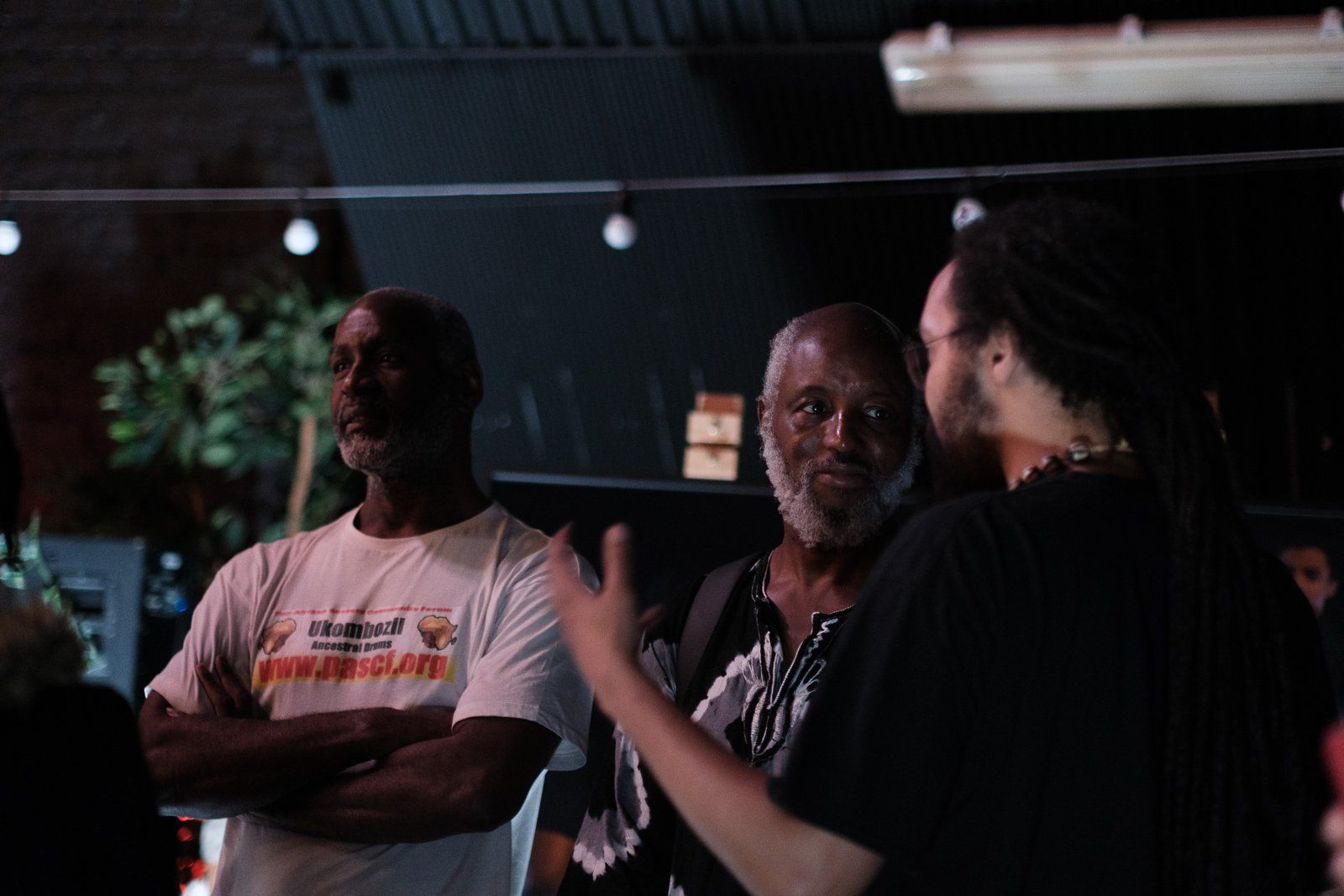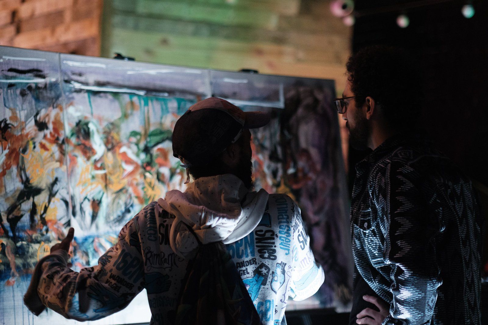 The sold-out premiere installation of 'Drummer Warrior Storyteller' was held in East London venue The Hackney Social on August 22nd 2021, marking the 230th anniversary of the start of the Haitian Revolution. The event included a screening of the projects first short film, expanded painting created through the filming process, photography by Ekua McMorris, live painting by Dora Lam, a Q&A / discussion hosted by Victoria Nzeribe (Love of Culture) with Apex Zero, Steph Be, Ekua McMorris, Dora Lam, tyroneisaacstuart, Priestess Osunyemi, Jonzi D, Muti Musafiri, Omowale Pert-Hru and Shezal Laing, live performances from Apex Zero, Isatta Sheriff, Ukombozii Ancestral Drums and music from DJ Steaz.